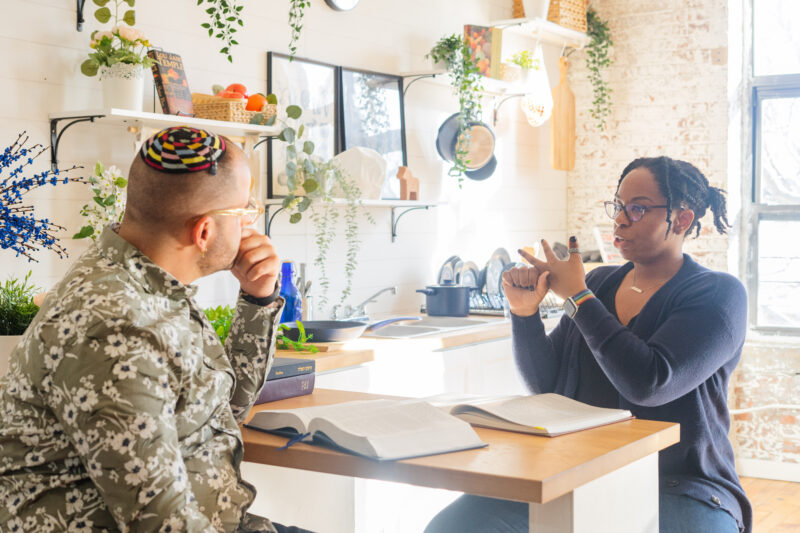 Ammud teacher Rabbi Heather studying Torah with an Ammud student.