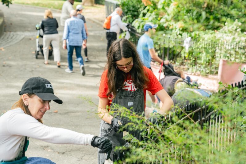 Participants in Adamah's Rooted program clean up in a park in New York City as part of the city's Climate Week on Sept. 21, 2025.
