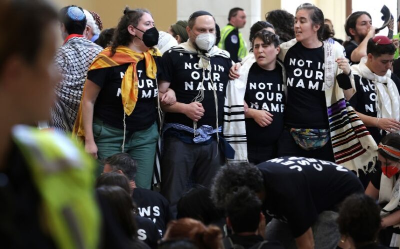 Members of the Jewish Voice for Peace and the IfNotNow movement stage a rally in the U.S Capitol building to call for a cease fire in the Israel–Hamas war in 2023. Alex Wong/Getty Images