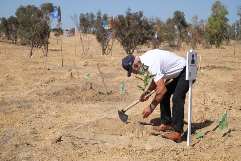 Eli Taher, the chairman of Yad L’Banim, which commemorates fallen soldiers, plants a tree in honor of his son, Yossi Taher, who was killed in the Oct. 7 terror attacks, in the Keren Kayemeth LeIsrael-Jewish National Fund’s ‘Iron Swords Forest,’ which was inaugurated outside Kibbutz Beeri on Oct. 21, 2025.
