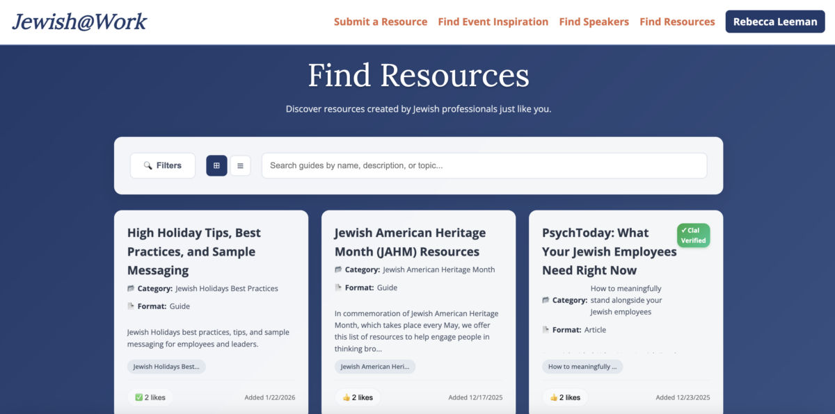 That’s why we at Clal built the Jewish@Work Resource Portal. It is a hub to offer real-world support with three core components: resources to navigate being Jewish in the workplace (including Kosher food vendors), event templates and a speakers bureau. It features over 100 resources, ranging from mental health support to holiday programming ideas, antisemitism speakers and comedians. The portal will add more features to continue to meet the needs of Jewish employees across the country.