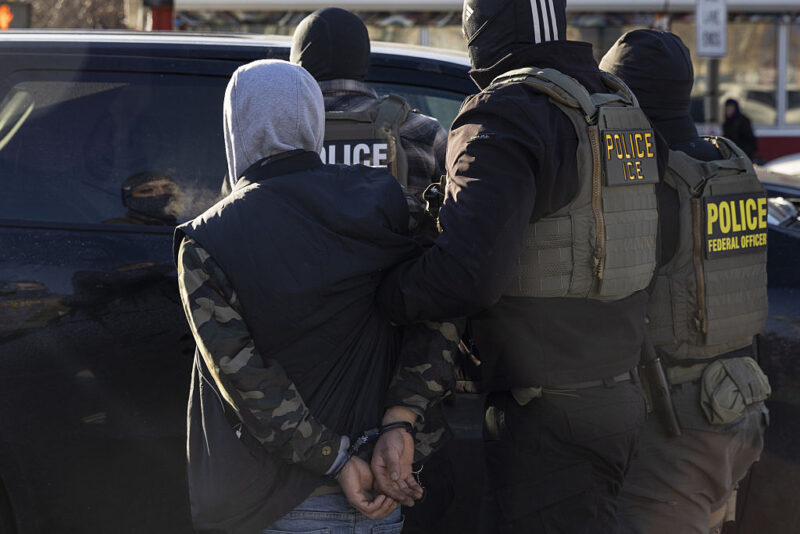 Federal agents arrest a man after stopping and questioning him in the street during an Immigration Enforcement Operation in Minneapolis on Jan. 14, 2026.