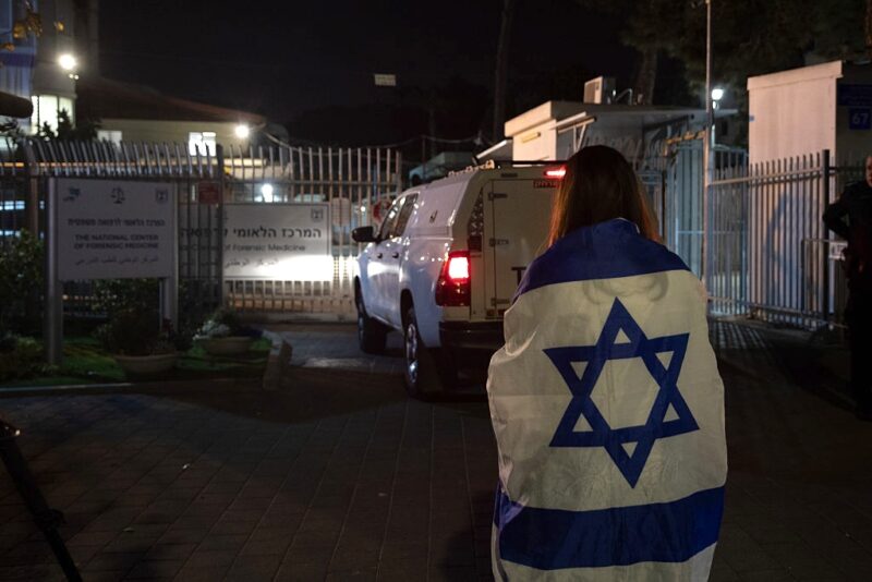 The vehicle carrying the body of the last Israeli hostage remaining in Gaza, Ran Gvili, arrives the Abu Kabir Forensic Institute prior to the funeral ceremony in Tel Aviv on Jan. 26, 2026.