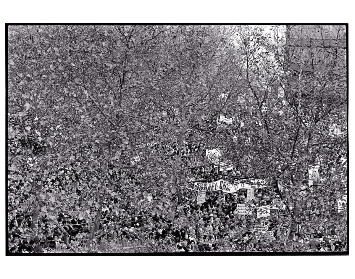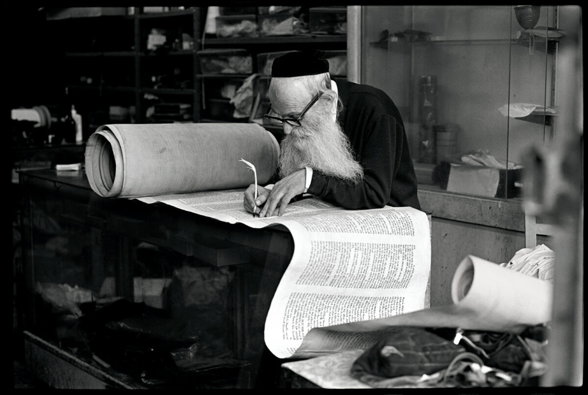 My own photographs. I have this one photograph that has almost never been seen, and it’s in the New York exhibition. It’s the protest of [PLO leader Yasser] Arafat’s visit to the U.N., [in 1974] and it takes place in the U.N. Plaza. And when he came he was wearing his gun on his hip, and the Jewish community was just outraged that he was addressing the General Assembly. So there was a big demonstration called for the plaza by the U.N. I guess I hadn’t been doing this long enough, I couldn’t get a press pass to be up by the podium and where all the speeches were. So I’m wandering around, and I find an open office building. The plaza is like a valley. There are two tall buildings on both sides of it. So I wandered up to the roof, and I looked down, and at first, all I could see were the tops of trees. It was the fall, and there are some old leaves there, dying leaves hanging from the trees sporadically. But all I could see were these few leaves and the twigs of the trees, the bare twigs. And then I looked through and I saw the people underneath. In the photograph, flattening it to a two-dimensional frame, you have to really look at the photograph to see the people, and when you do, it’s a totally different experience. In fact, my 8-year-old grandson, he went through the exhibit in New York with his dad pretty carefully, and he just fell in love with that picture and asked for a copy. But you have to look at it, and that’s probably my favorite image. My best-known images [are] of the scribe on the Lower East Side of New York.