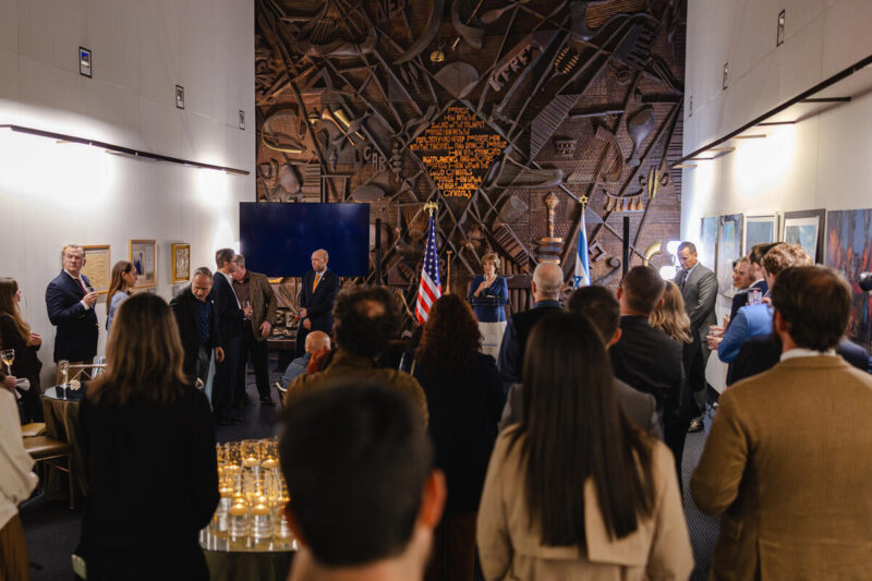 Visitors attend an event for an exhibit of art related to the Oct. 7 terror attacks at the Israeli Lounge of the Kennedy Center on Oct. 9, 2025.
