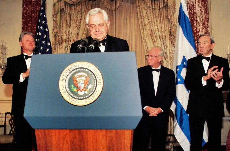 Stanley Chesley speaks at a United Jewish Appeal reception, next to President Bill Clinton and Israeli Prime Minister Yitzhak Rabin, at the White House in Washington on Oct. 25, 1995.