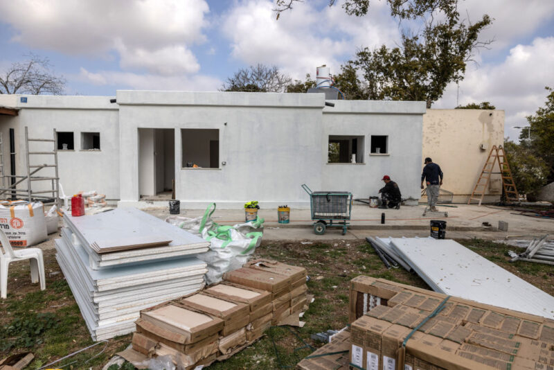 Construction workers renovate a house that was damaged on Kibbutz Nirim during the Oct. 7 attacks by Hamas terrorists, on Feb. 16, 2025.