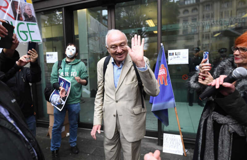 Former Mayor of London Ken Livingstone waves outside Westminster Magistrates' Court in London where Wikileaks founder Julian Assange is due to appear for a case management hearing relating to his extradition to the United States over allegations that he conspired to break into a classified Pentagon computer, on Oct. 21, 2019.