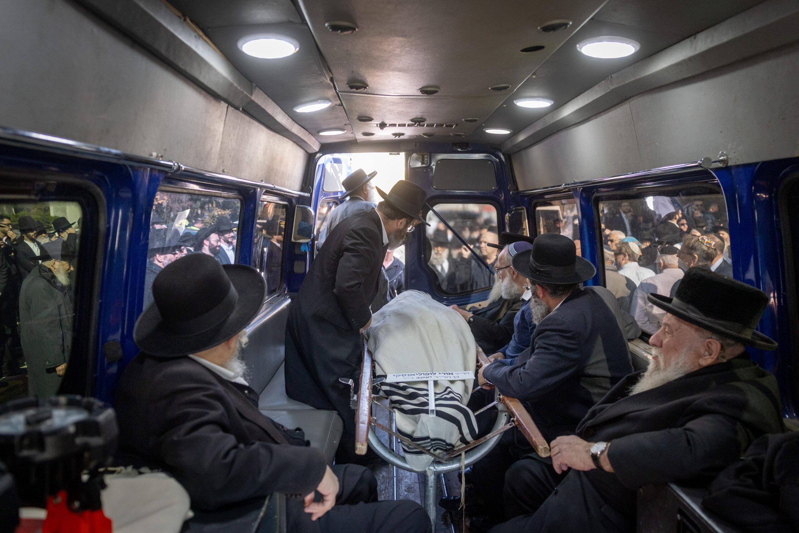 The body of Rabbi Uri Lupolianski, the first Haredi mayor of Jerusalem and founder of the Israeli Yad Sarah medical nonprofit, who died yesterday at 74, is loaded into a van today as he is brought to the city’s Har HaMenuchot cemetery for burial.