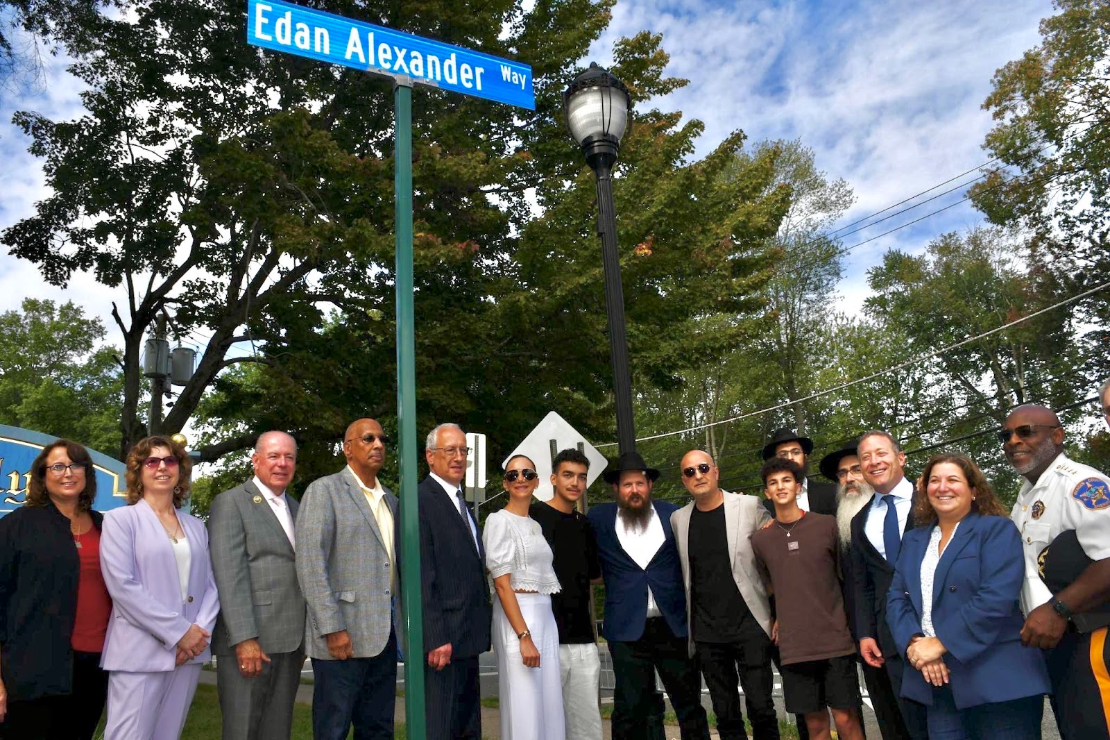 Freed American Israeli hostage Edan Alexander (center; black shirt) attends the inauguration of a street named in his honor in his hometown of Tenafly, N.J. yesterday. The street, formally known as River Edge Road, will now be named “Edan Alexander Way.”