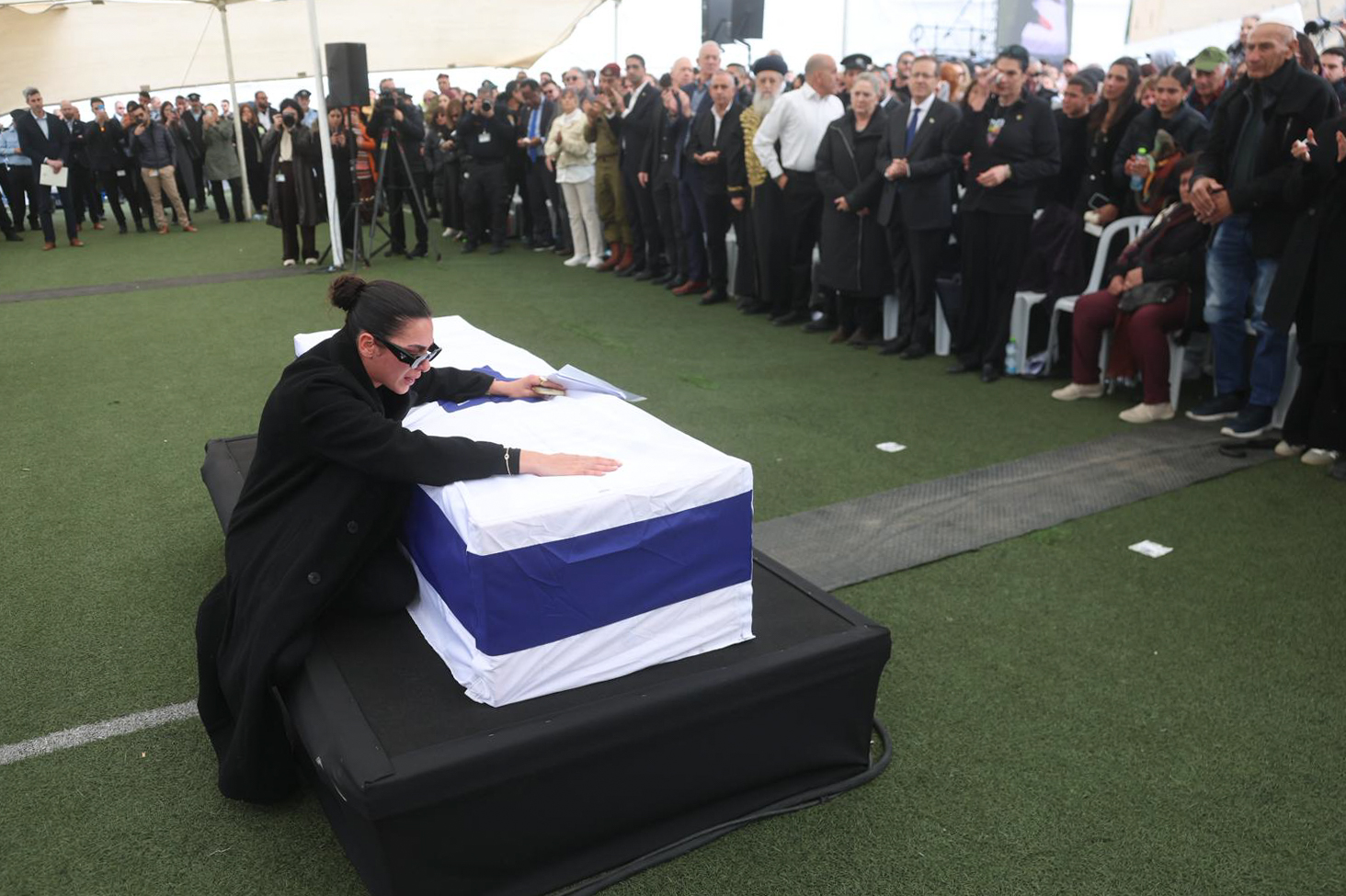 Shira Gvili, the sister of Israeli Police officer Ran Gvili, the Israeli hostage whose remains were recovered by Israel from a cemetery in Gaza City earlier this week, weeps over his coffin today during his funeral in the southern Israeli town of Meitar.