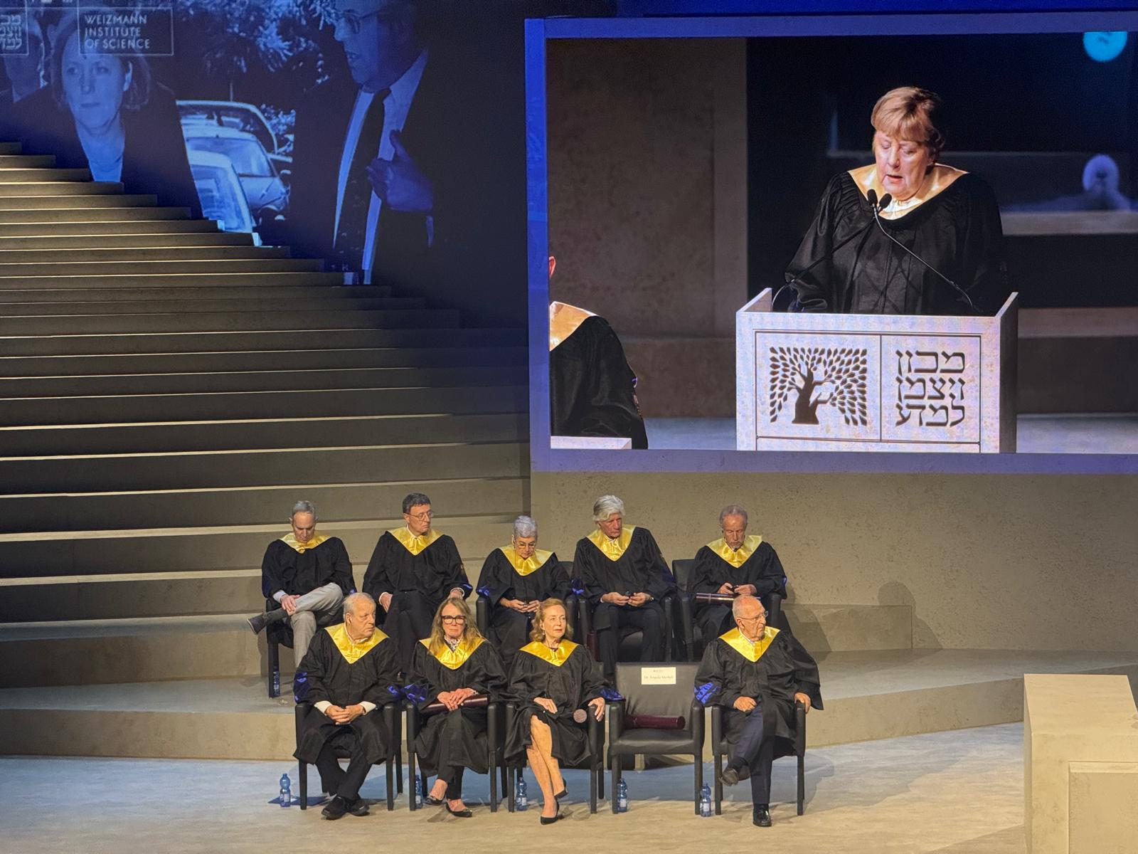 Former German Chancellor Angela Merkel receives an honorary doctorate yesterday from Israel’s Weizmann Institute of Science. The other recipients are: philanthropist Karen W. Davidson, Moroccan-born businessman Maurice Lévy, Russian-born biologist Eugene V. Koonin, philanthropist Ilana Ronat-Mantoux, entrepreneur Yehudit Bronicki and German biologist Patrick Cramer.