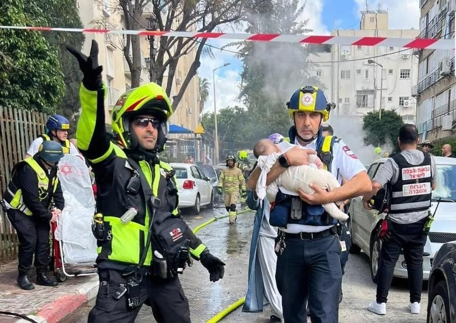 Paramedic Fadi Hamdan from the Magen David Adom ambulance service carries a baby to safety today after an Iranian ballistic missile struck the central Israeli city of Petah Tikva, injuring eight people and setting fire to a number of cars.