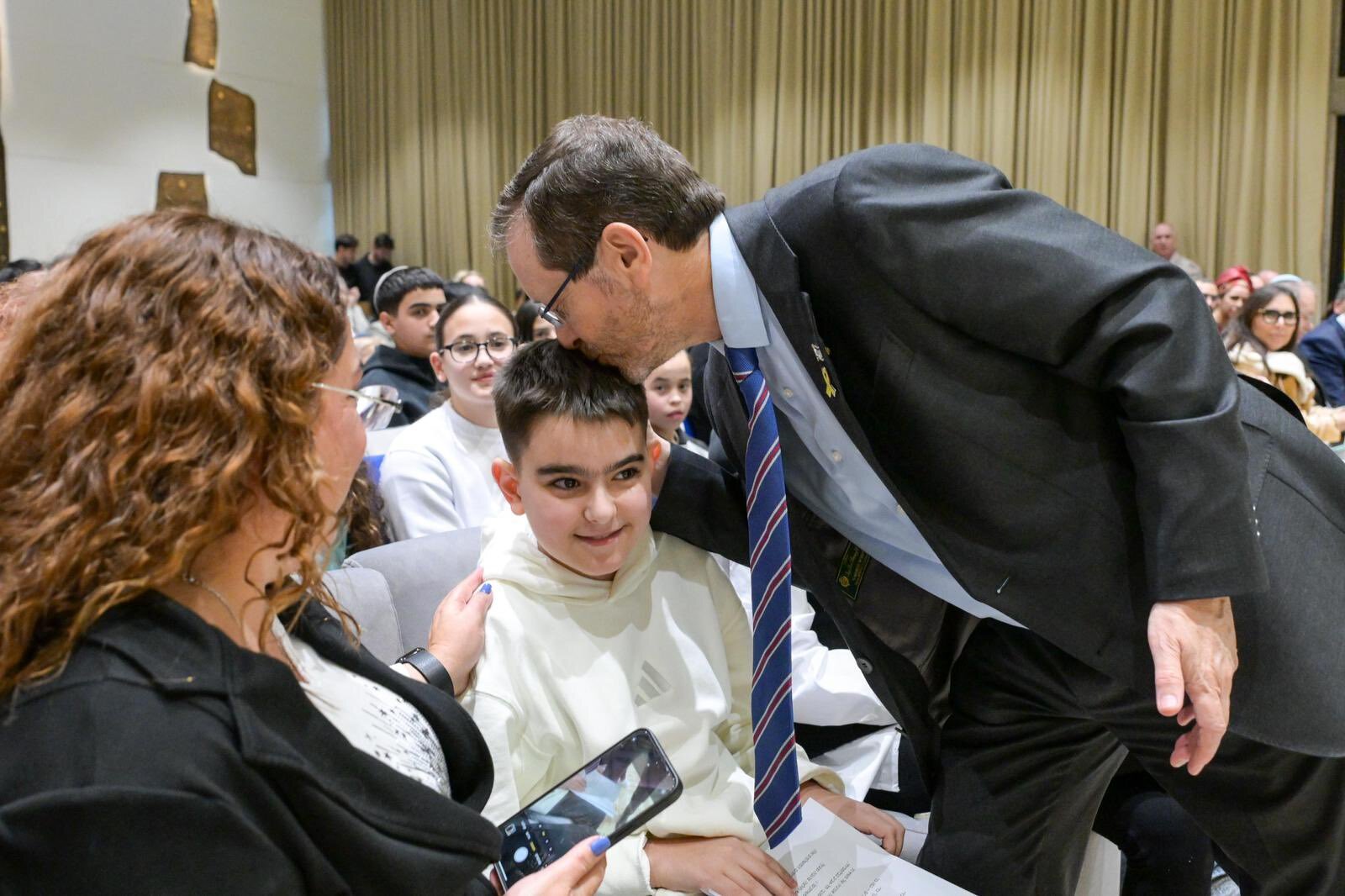 Israeli President Isaac Herzog participates in a bar and bat mitzvah event for the children of terror victims yesterday at the President’s Residence in Jerusalem. Approximately three dozen children participated in this year’s event, which was arranged by the Organization for Victims of Terror Attacks.