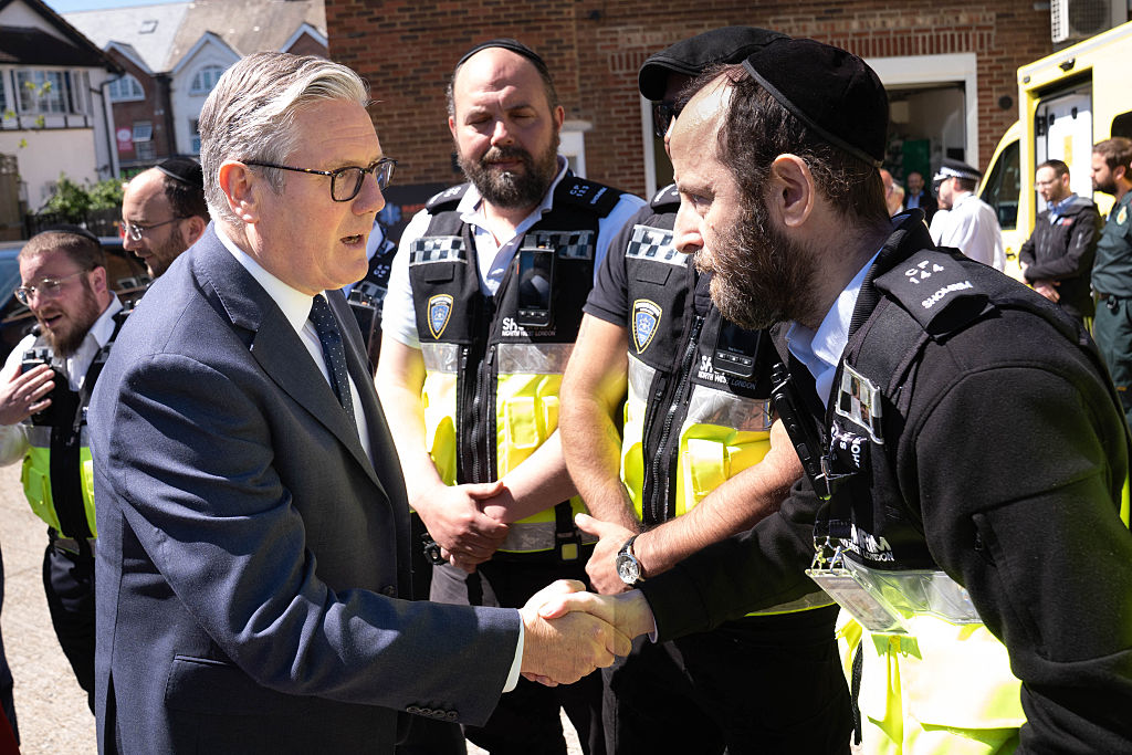 British Prime Minister Keir Starmer (left) meets first responders from the Jewish security group Shomrim North West London today during a visit to the heavily Jewish suburb of Golders Green after yesterday’s terror stabbing in the area in which two Jewish men were injured.